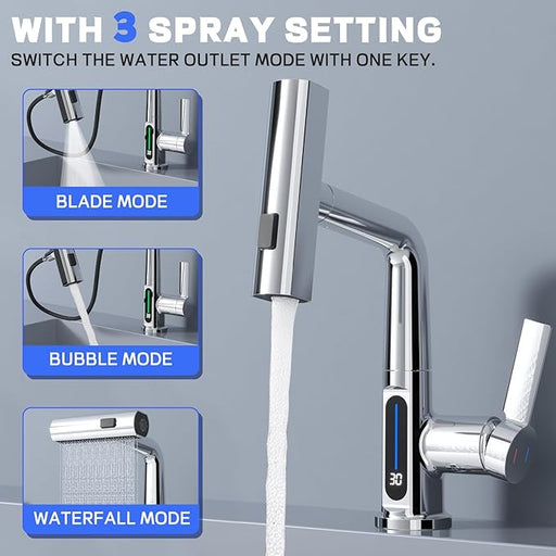 Modern Single Hole Basin Faucet with Waterfall, Pull Out Sprayer and LED Temperature Display, Chrome Silver